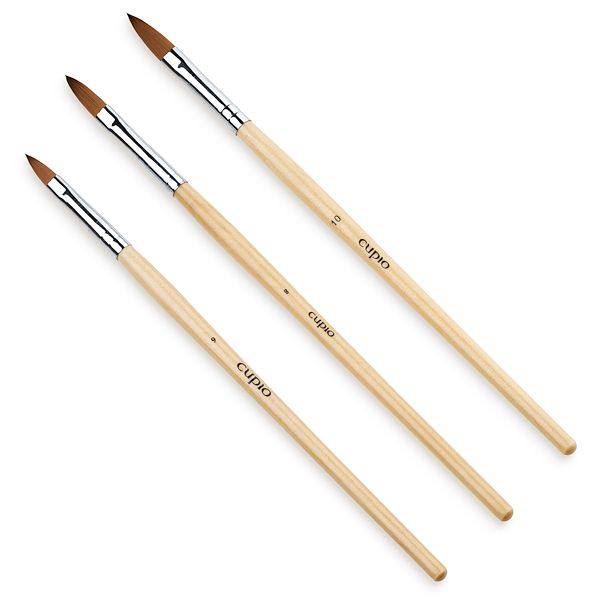 Set mit drei Pinseln für Acryl. Die Acrylpinsel bestehen aus Naturhaar, und die Spitze der V-förmigen Pinsel ermöglicht das schnellere und präzisere Modellieren von Kunstnägeln. Mit ökologischem Griff aus Holz. Das Set enthält Acrylpinsel Nr. 6, 8 und 10.