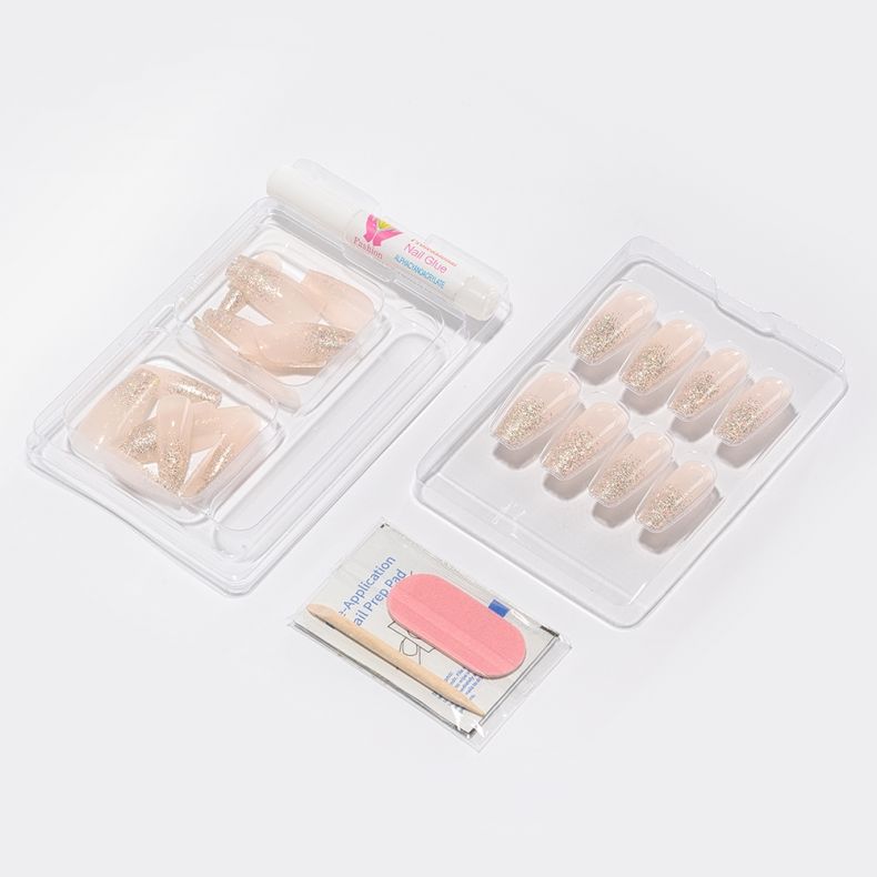 Künstliche Nägel mit schneller und einfacher Anwendung. Das Set enthält 24 Tips, eine Nagelfeile, Kleber, ein Stäbchen zum Schieben der Nagelhaut und ein Alkoholpad.