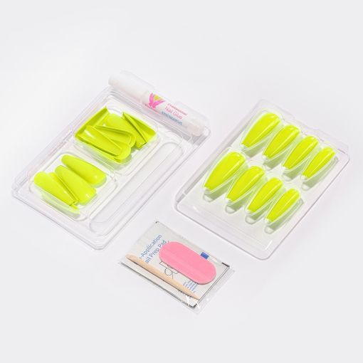 Künstliche Nägel mit schneller und einfacher Anwendung. Das Set enthält 24 Tips, eine Nagelfeile, Kleber, ein Stäbchen zum Schieben der Nagelhaut und ein Alkoholpad.