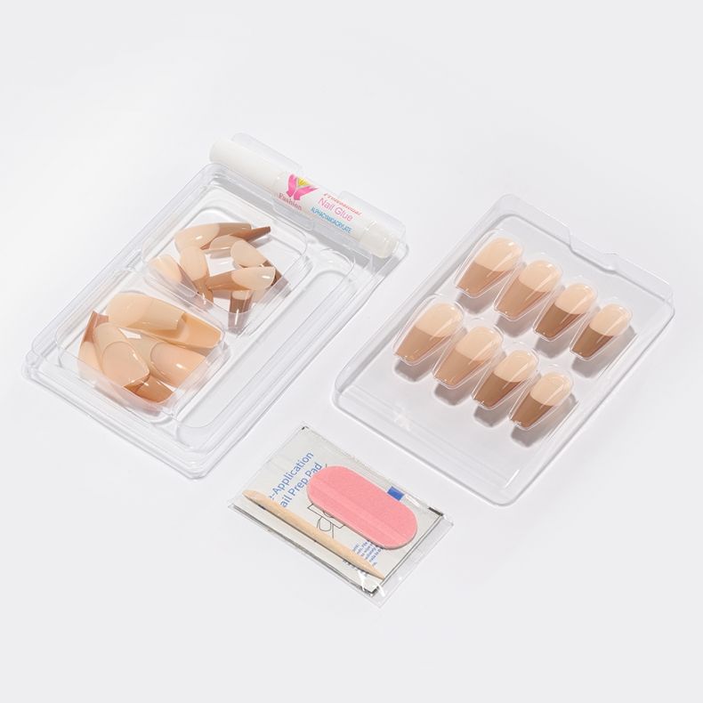 Künstliche Nägel mit schneller und einfacher Anwendung. Das Set enthält 24 Tips, eine Nagelfeile, Kleber, ein Stäbchen zum Schieben der Nagelhaut und ein Alkoholpad.