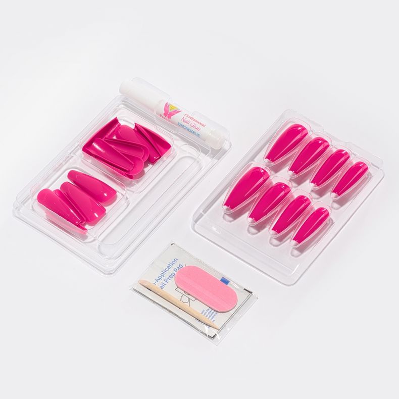 Künstliche Nägel mit schneller und einfacher Anwendung. Das Set enthält 24 Tips, eine Nagelfeile, Kleber, ein Stäbchen zum Schieben der Nagelhaut und ein Alkoholpad.