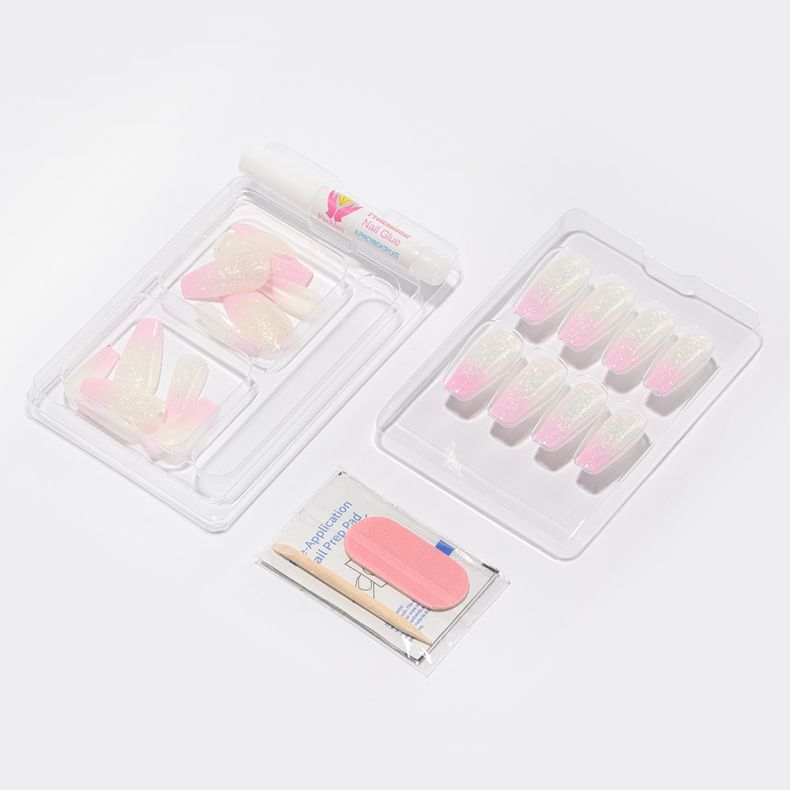 Künstliche Nägel mit schneller und einfacher Anwendung. Das Set enthält 24 Tips, eine Nagelfeile, Kleber, ein Stäbchen zum Schieben der Nagelhaut und ein Alkoholpad.