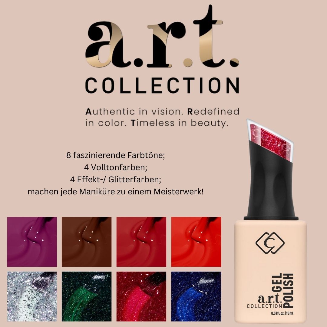 Entdecken Sie den Zauber des Winters in der neuen ART-Kollektion semipermanenter Gellacke, in der Kunst auf die Eleganz der festlichen Jahreszeit trifft. Diese exklusive Auswahl aus 8 faszinierenden Farbtönen macht jede Maniküre zu einem Meisterwerk und verbindet Eleganz perfekt mit der Weihnachtsstimmung.