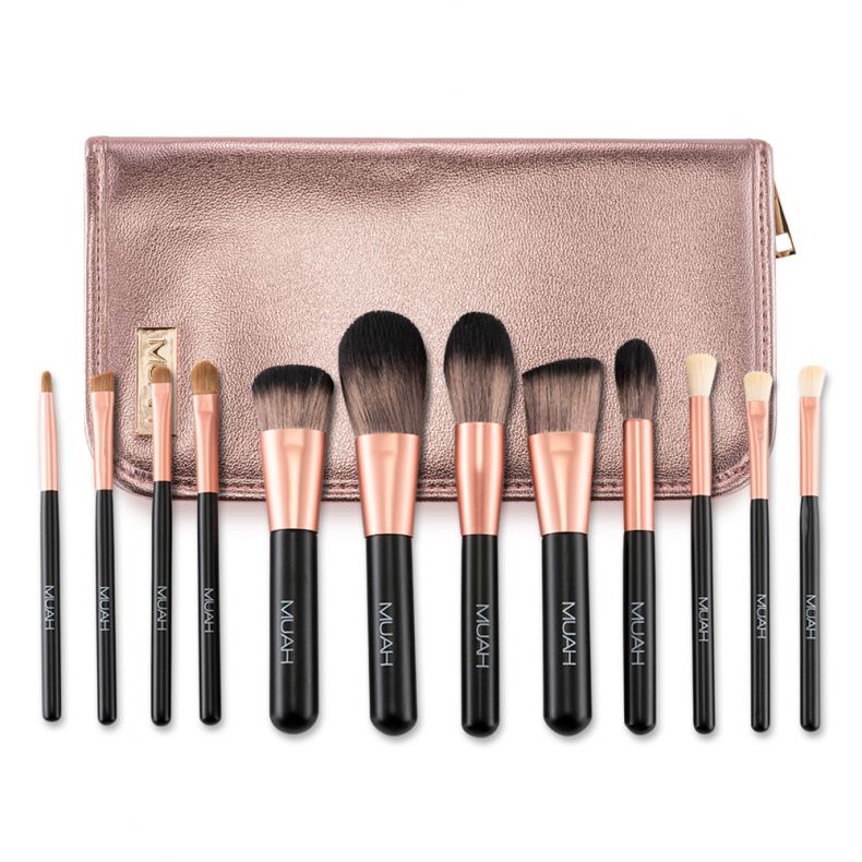 Die Pinsel werden zur Aufbewahrung in einem roségoldenen Etui geliefert.