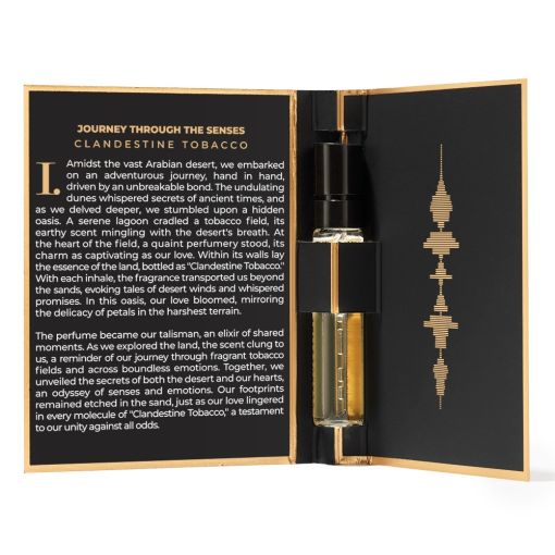 Mitten in der riesigen arabischen Wüste begaben wir uns Hand in Hand auf eine abenteuerliche Reise, geführt von einer unerschütterlichen Bindung. Die welligen Dünen verrieten uns Geheimnisse aus alten Zeiten und als wir tiefer gingen, stießen wir auf eine verborgene Oase. In einer ruhigen Lagune befand sich ein Tabakfeld, dessen erdiger Duft sich mit dem Atem der Wüste vermischte. Mitten auf dem Land lag eine malerische Parfümerie, deren Charme uns ebenso in ihren Bann zog, wie unsere Liebe. In seinen Mauern befand sich die Essenz der Erde, abgefüllt unter dem Namen „Clandestine Tobacco“.