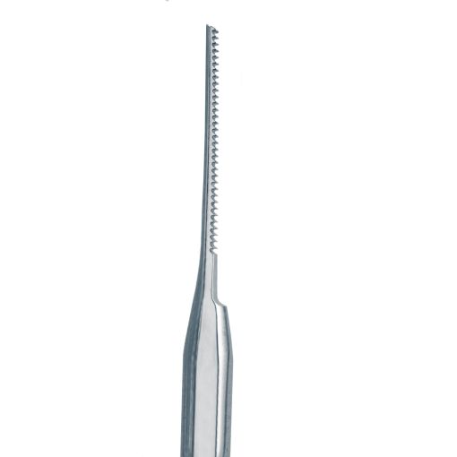 Das Werkzeug ist mit zwei dünnen Arbeitsenden ausgestattet: einem geraden und einem gebogenen, beide mit einer geriffelten, abrasiven Oberfläche, ähnlich einer Feile;
