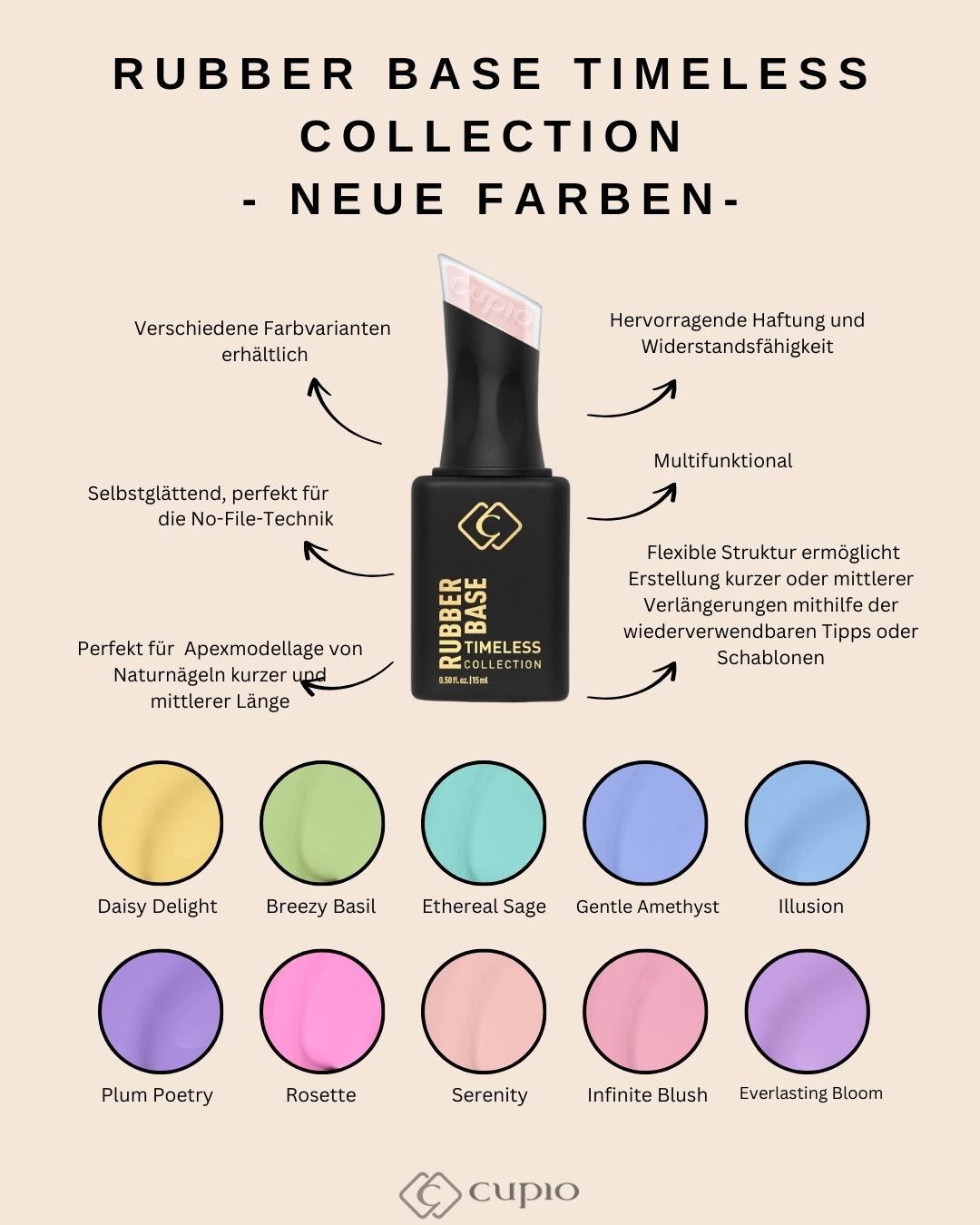 Die Rubber Base Timeless Collection erweitert seine Farbpalette um neue Pastelltöne, perfekt für eine elegante und trendige Maniküre!Die Rubber Base Timeless Collection ist ein super-multifunktionales Produkt, das den am häufigsten nachgefragten Salondienstleistungen gerecht wird.