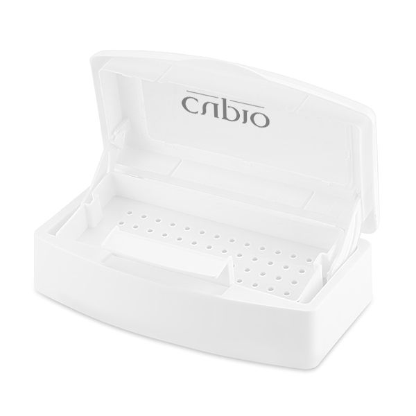 Kunststoffbox zum Sterilisieren von kleinen Instrumenten. Die Box ist mit einer abnehmbaren und verschiebbaren Schale versehen, auf die die zu sterilisierenden Instrumente gestellt werden.
